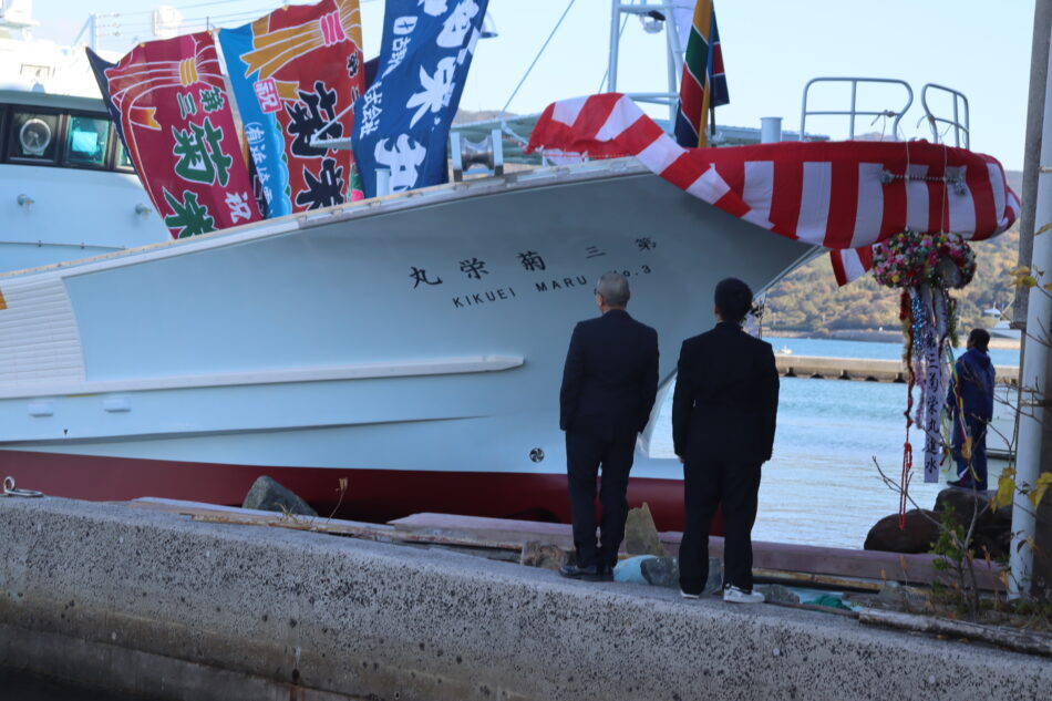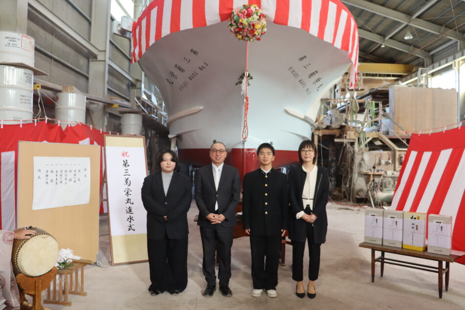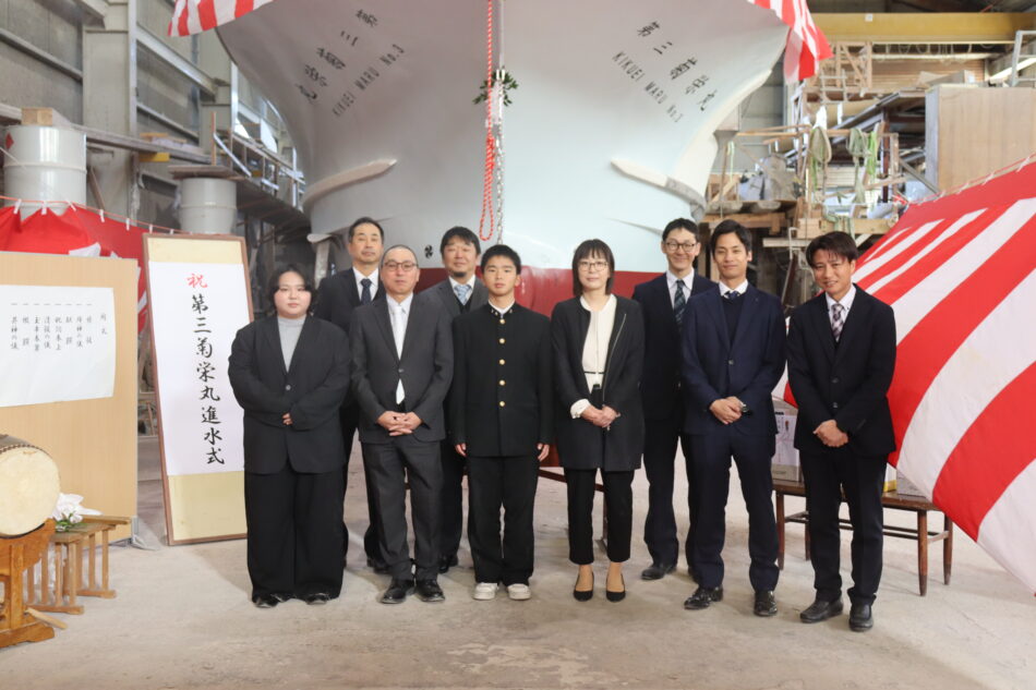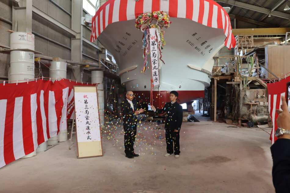 19t型バイ・カニカゴ漁船 「第三菊栄丸」祝 進水! 投稿日時: 2025年12月6日 投稿者: nishi-f 本日、(有)菊栄漁業様向け「第三菊栄丸」が無事進水致しました。 式典の様子です! 廻航日まで気を緩めることなく、作業を進めて参ります。